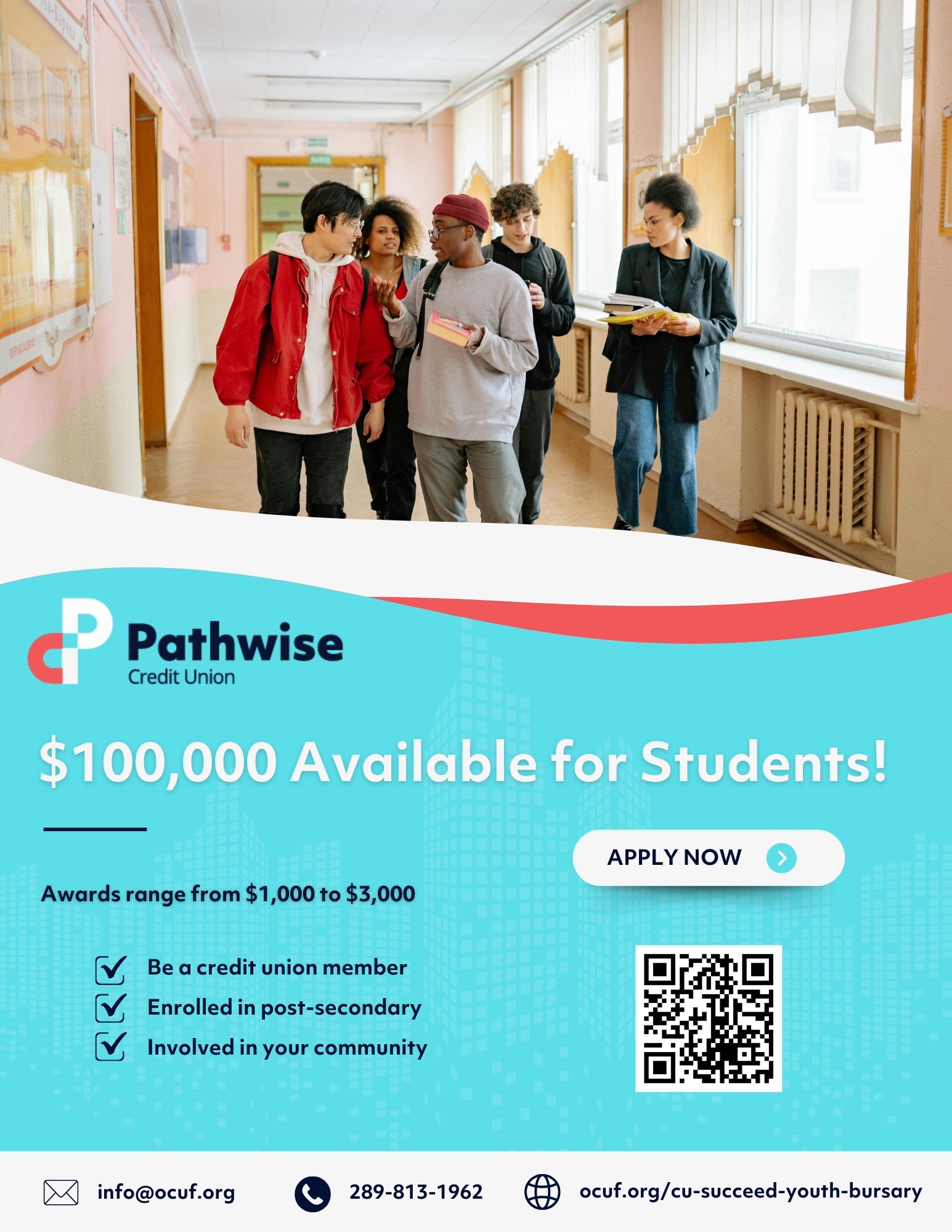 We’ve put together some materials for you to use to promote the CU Succeed Youth Bursary that is open April 30 – June 30. Feel free to use them as is, or customize them with your credit union’s brand colours and logos. We can provide a customized poster if you email rea@ocuf.org with a copy of your logo and desired brand colours, and we’ll get working on them right away!
